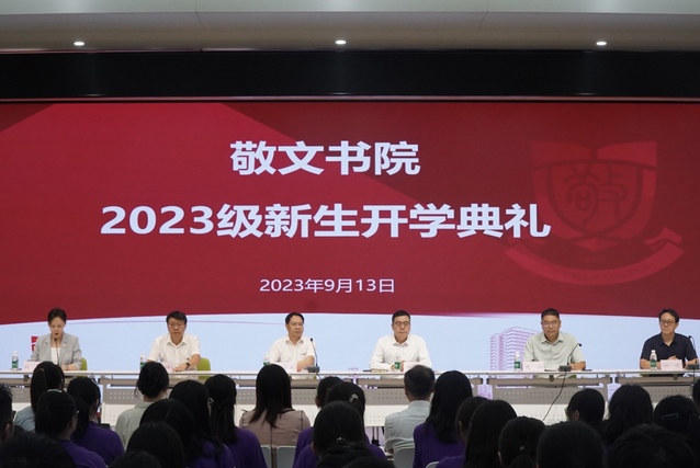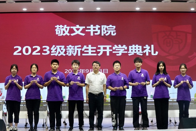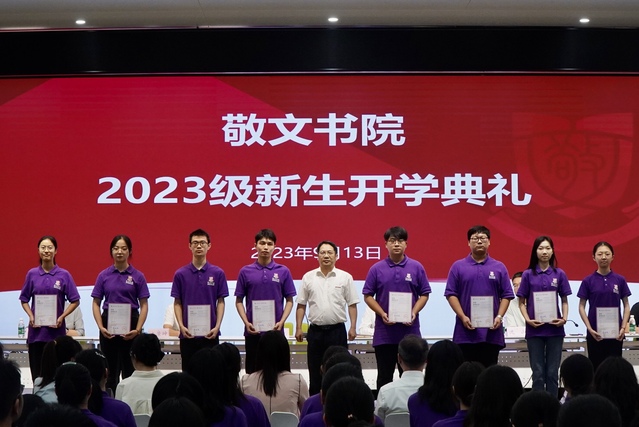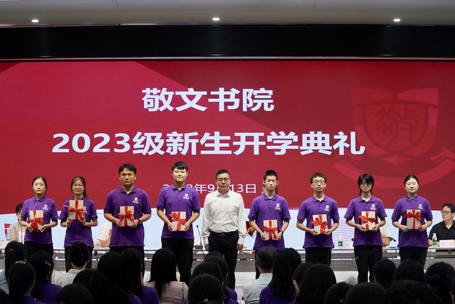 9月13日上午,敬文书院2023级新生开学典礼在路演大厅隆重举行。校长周汝光、副校长赵鹏,导师代表生命科学学院田俊教授出席典礼。敬文书院全体教职工及2023级全体新生参加典礼,新生家长通过直播收看开学典礼。典礼由院党委副书记杜昀主持。沈山院长首先发布了书院2023级新生大数据。经过网上报名、材料审核、视频面试、家校会谈、卓越能力认定和综合面试等环节,共有含28名绿色通道在内的145名新生进入敬文书院。大数据对总分最高分、单科最高分、新生的年龄分布、性别比例、生源地情况等信息进行了分析。随后新生代表2023级数学与应用数学师范专业张晶莹,老生代表学生会主席团成员、2021级汉语言师范专业夏琦玮以及导师代表生命科学学院田俊教授先后发言。张晶莹同学分享自己进入书院后的所见所感,表达了对美好大学的无限憧憬。夏琦玮同学代表全体老生对新同学的到来表示热烈欢迎,并分享了大学学习、生活、工作的宝贵经验。导师代表田俊教授对新生们提出了崇德尚德、厚学笃行、履践致远的共勉期望,并祝愿同学们在未来的四年里,揽万卷文集,汲百代精华,认认真真学习、踏踏实实做人,心有热爱,常怀感恩,在敬文书院携手共赴星辰大海。周汝光校长在讲话中对2023级145名新同学成功进入敬文书院表示热烈欢迎和诚挚祝贺,他指出,同学们选择敬文书院,也就是选择了奋斗与挑战、创新与卓越、使命与担当。作为敬文学子,应热爱祖国、牢记使命担当,志存高远、潜心求学问道,相信自己、矢志踔厉奋发。周校长希望同学们能刻苦学习,奋勇拼搏,以有为之身、展鸿鹄之志,行而不辍、履践致远,志存高远,脚踏实地,做卓越敬文人。 典礼上,周汝光校长为新生代表颁发敬文书院录取荣誉证书,赵鹏副校长赠予新生代表《知行敬文》一书,书院党委书记朱景坤向新生代表授予院徽。全体新生手抚院徽、面对院旗进行入院宣誓,坚定而洪亮地表达了“志在许国,吾为栋梁”的豪情壮志。开学典礼在激昂的《奔跑吧,敬文的少年》歌声中落下帷幕。