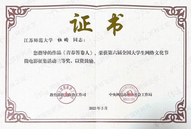 近日,由教育部思想政治工作司、中央网信办网络社会工作局联合主办的第六届“全国大学生网络文化节”遴选结果公布,书院师生作品《青春答卷人》荣获微电影类作品三等奖,在来自清华大学、北京大学等高校报送的30000余件作品中脱颖而出。 微电影《青春答卷人》刻画了疫情时期,在小家温暖与大国担当间挣扎矛盾、在思政教导感化下最终成长的大学生形象。该影片以小家庭的离合悲欢暖故事为切入点,从青年学生细微的内心刻画入手,用身边人与身边事的共鸣,用理想信念与个人价值的碰撞,用青年大学生的成长与蜕变,展现当代大学生追寻初心、担当使命的信念与情怀,用奉献书写新时代的青春答卷。本次大赛中,敬文书院积极响应学校号召,鼓励师生积极参与网络文化节进行网络文化作品创作,高度重视网络思想政治教育工作,不断完善和优化网络育人路径,加强“互联网+思政教育”建设。书院将以此为契机,聚合资源,发挥优势,因时而进,因势而新,构建网络文化阵地,培养国际视野,凝聚青年力量。
